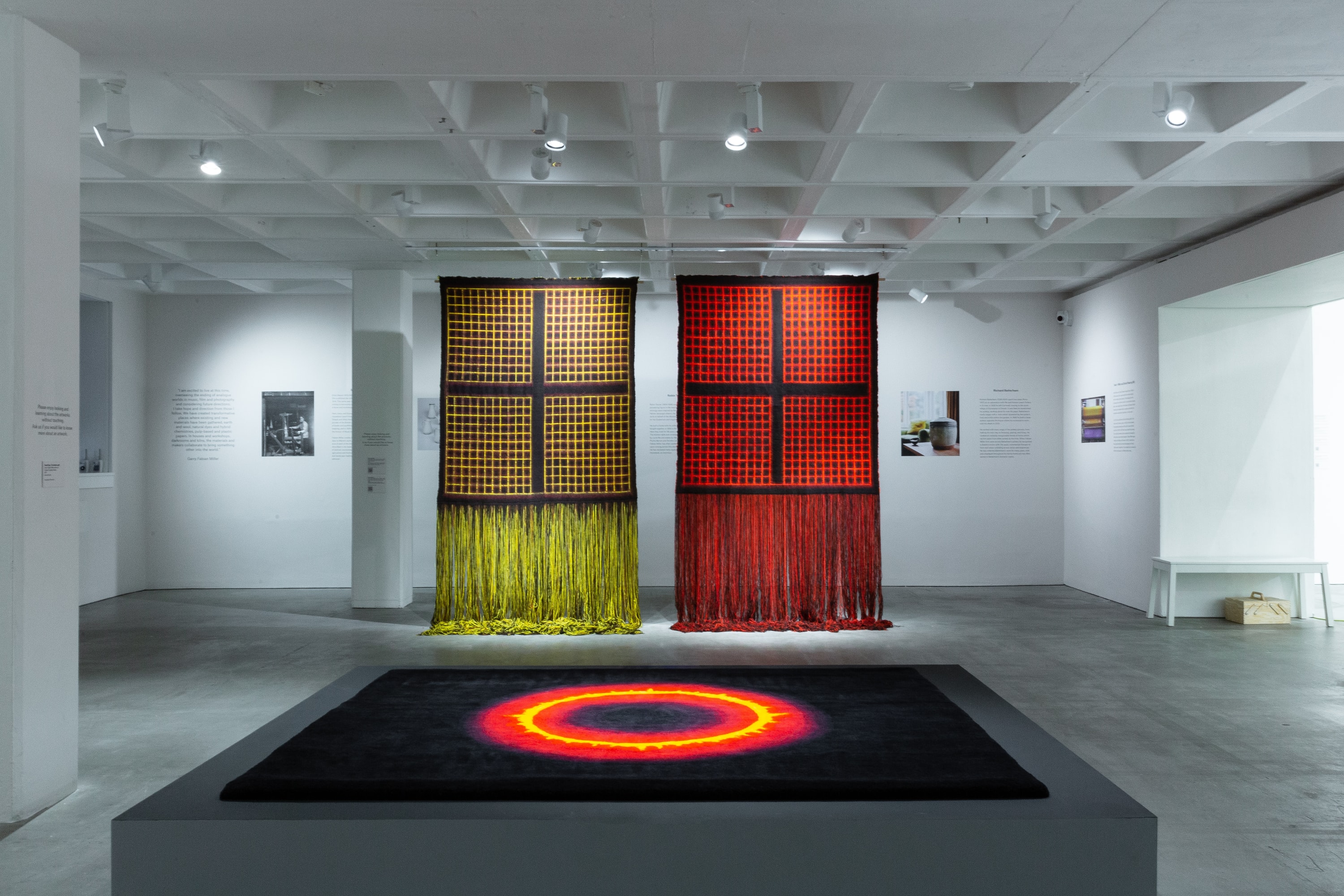 (from left to right) Garry Fabian Miller, Riuros (ii), Riuros (iii), (both) 2022, Shetland Wool, Italian Mohair, Merino Lambs Wool and Fluorescent Polyester Filaments, 54 x 90 inches. Edition of 3 + 1AP. Edition 1/3. Photograph: Lisa Whiting -